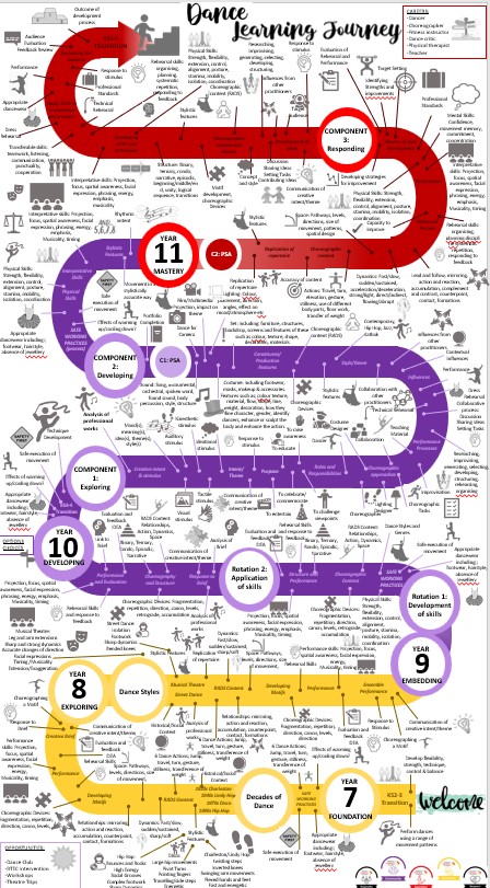 In Year 7 students will study dance through their PE curriculum and are introduced to a variety of dance skills, which form the basis for creating choreography, and develop their skills in creating, performing and responding. Students explore how dance has developed through different eras such as the 1920s Charleston and will gain an understanding of different stylistic features and performance skills. Students will use choreographic skills to create and perform their own motifs and evaluate the effectiveness of these.