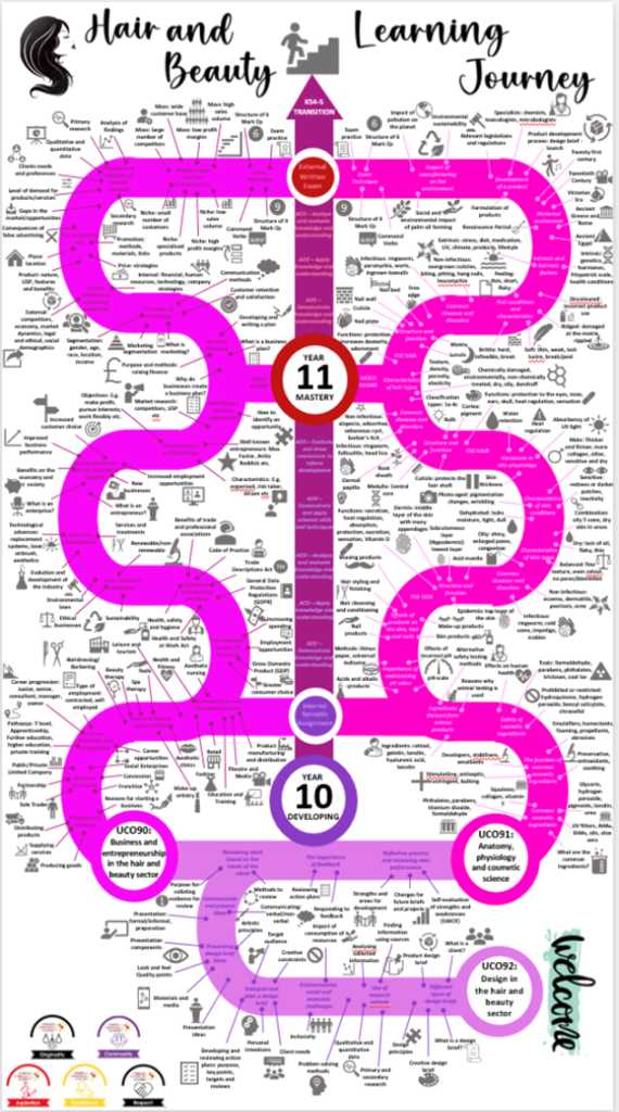 The KS4 VTCT specification content provides students with an understanding of the chemistry of hair, beauty and nail products, as well as the anatomy and physiology of the integumentary system. They will explore design skills and techniques that can be used within the hair and beauty sector, giving students opportunities to develop planning, research and presentation skills. Students also explore the business aspect of the hair and beauty sector, the broad related industries and understand the aspirational career pathways available. Students will explore the principles of marketing and how entrepreneurship supports the hair and beauty sector.
