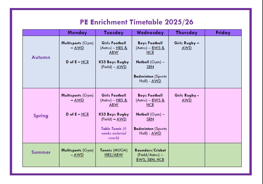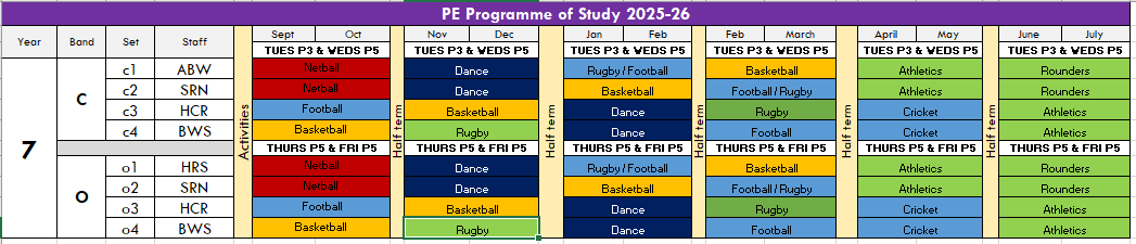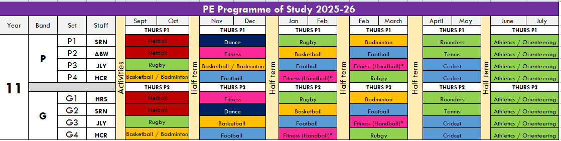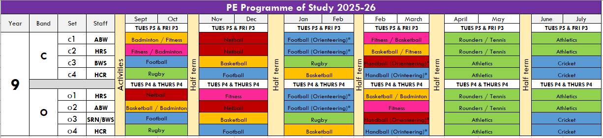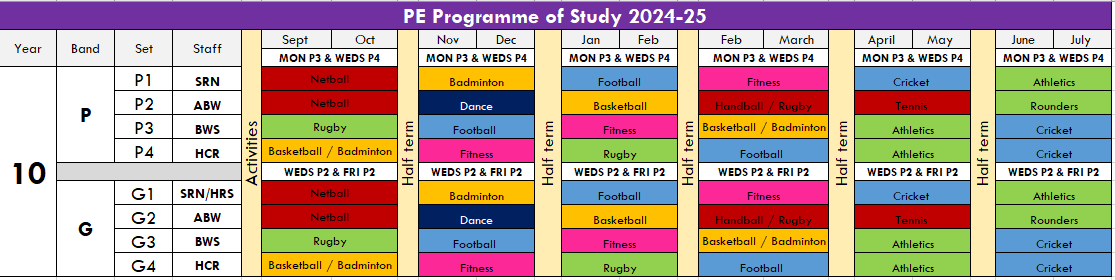 The below table outlines a typical programme of study for students in years 7-9. A wide range of sports will be covered based on the focus and facility the PE group has each half term.